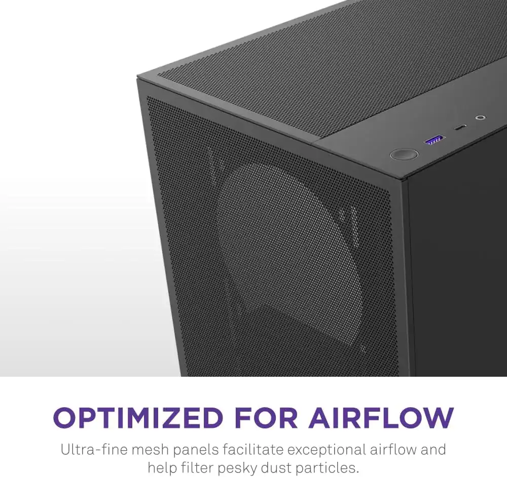 Una de las características más notables del NZXT H5 Flow 2024 es su enfoque en el flujo de aire optimizado, un aspecto clave al elegir un gabinete gaming con buena ventilación. Su diseño se ha optimizado para permitir que el aire circule de manera eficiente a través del gabinete, lo cual es fundamental para el rendimiento en PC gaming de alto rendimiento. Las rejillas de ventilación estratégicamente ubicadas y los espacios diseñados para la instalación de ventiladores y radiadores contribuyen a mantener temperaturas bajas durante largas sesiones de juego.