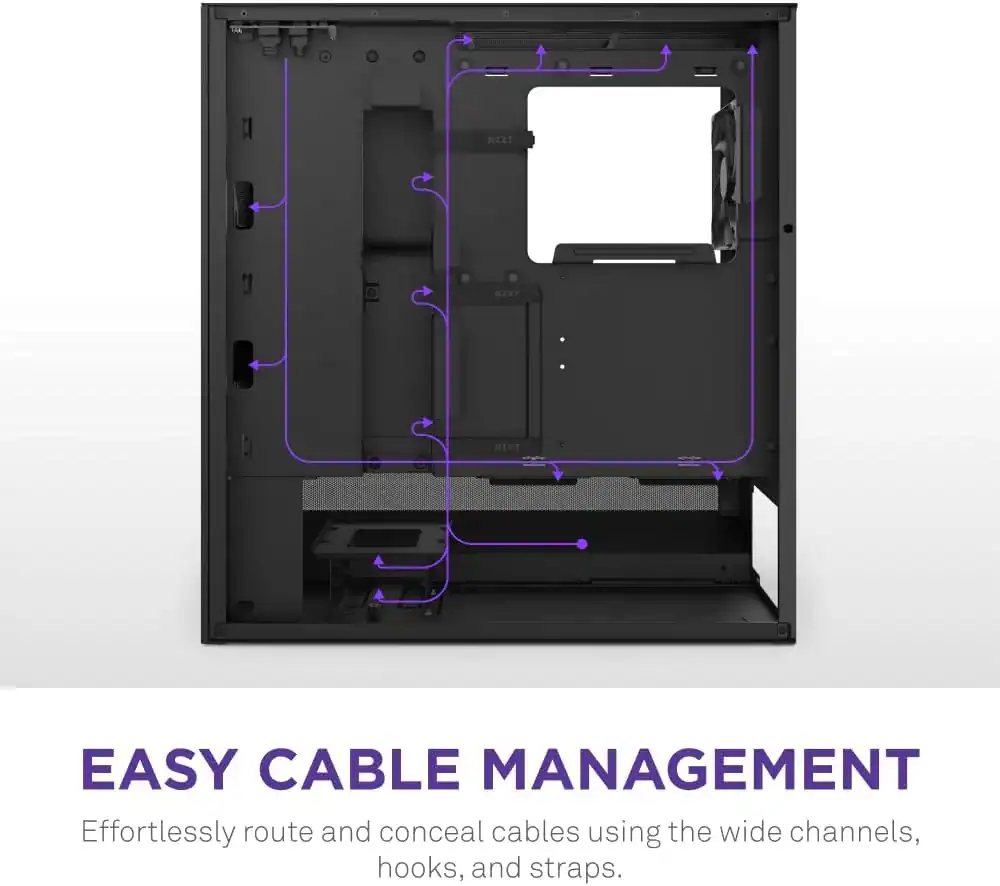 Además, el NZXT H5 Flow incluye ganchos y correas para organización de cables, lo que brinda opciones adicionales para asegurar y organizar los cables de manera eficiente. Esta flexibilidad en la gestión de cables del gabinete es particularmente apreciada por gamers, streamers y creadores de contenido, quienes suelen requerir múltiples conexiones para sus dispositivos.